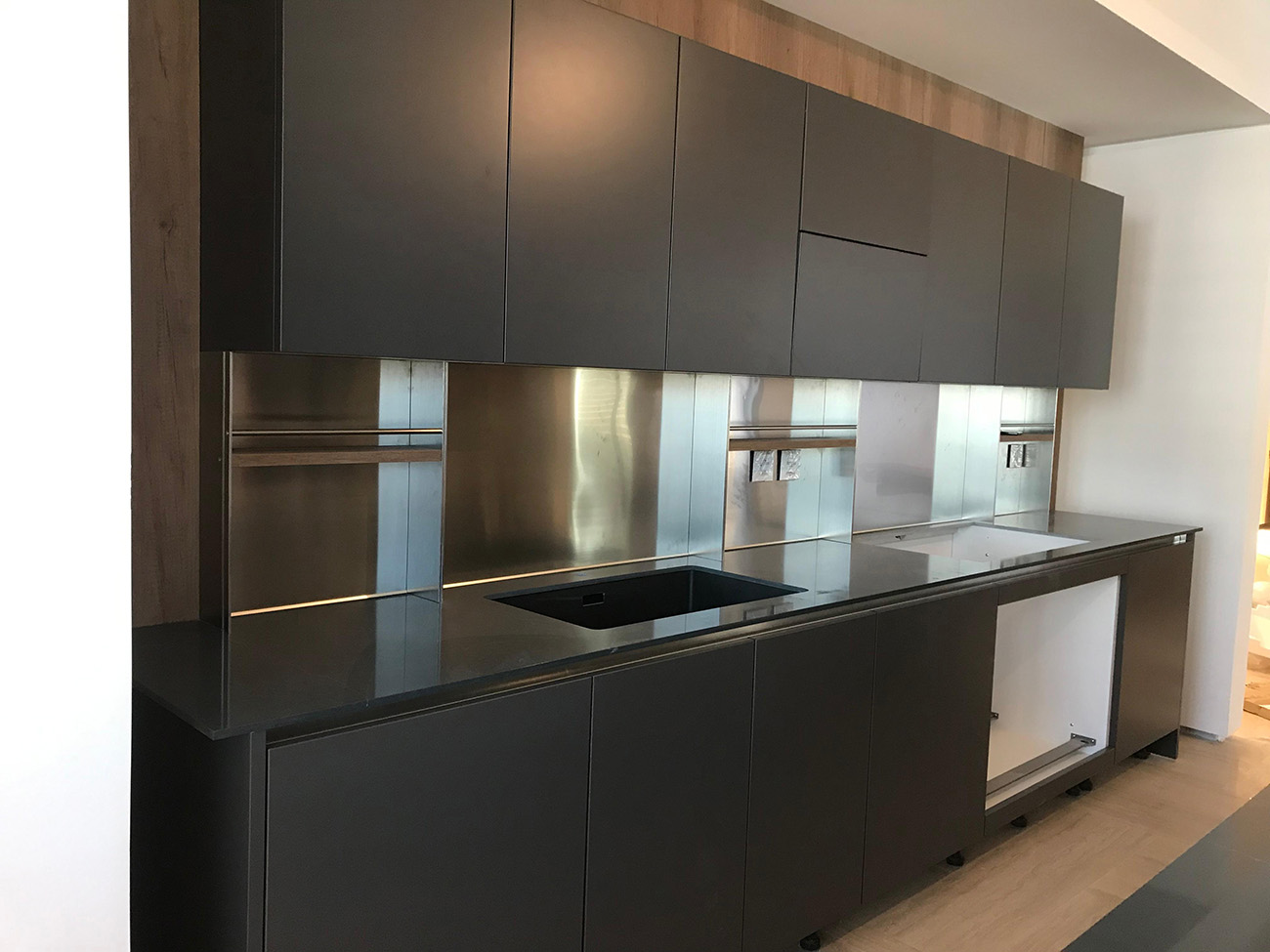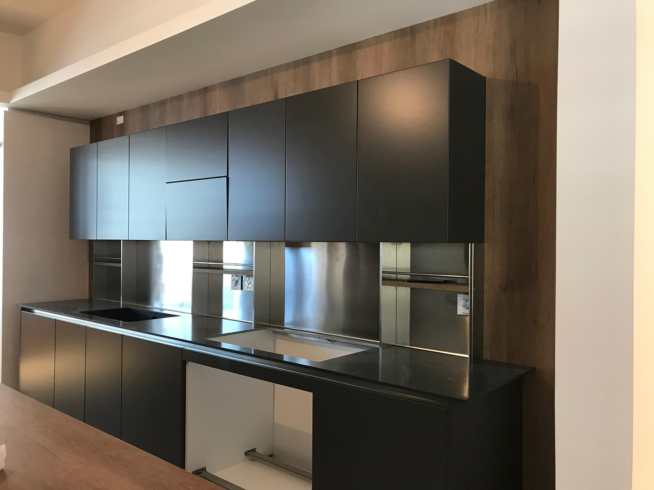 The defining feature of this space is its uninterrupted verticality. The appliance tower—featuring a flush-mount microwave and a professional convection oven—is integrated into the cabinetry with surgical precision. The reflective black glass surfaces act as dark mirrors, adding depth and a sense of infinite space to the room.